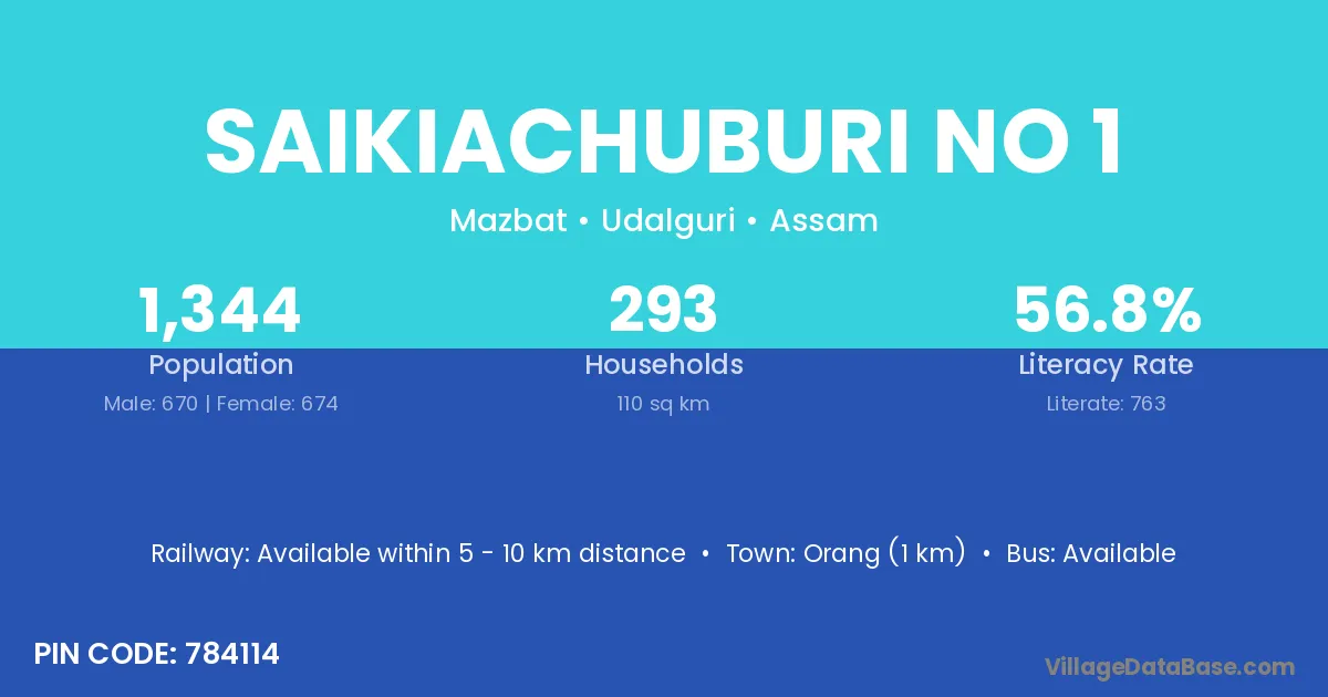 Orang (1 km) is the nearest town to Saikiachuburi No 1 village for major economic activities and is located approximately 1 km away.