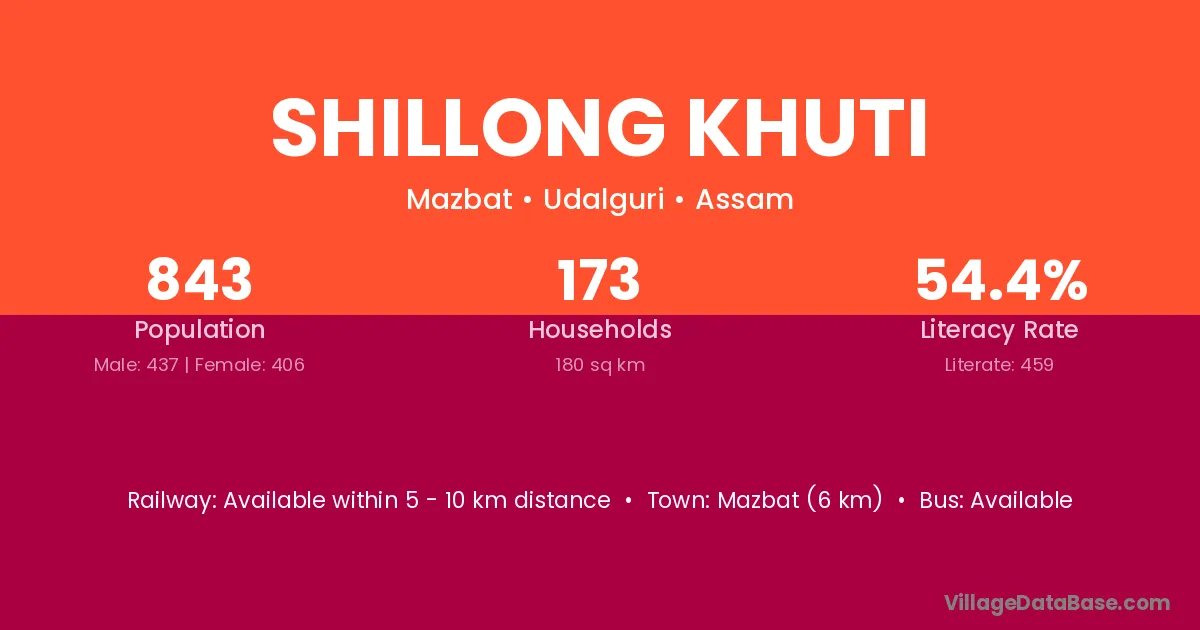 Mazbat (6 km) is the nearest town to Shillong Khuti village for major economic activities and is located approximately 6 km away.