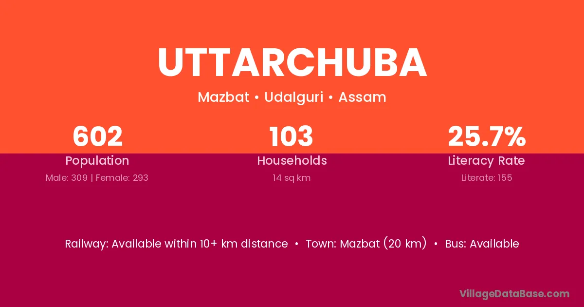 Mazbat (20 km) is the nearest town to Uttarchuba village for major economic activities and is located approximately 20 km away.