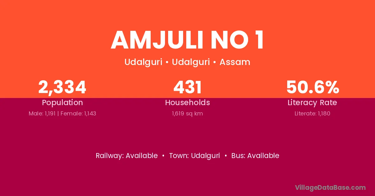 The literacy rate of Amjuli No 1 village is 50.56%. Male literacy stands at 56.26% and female literacy at 44.62%.
