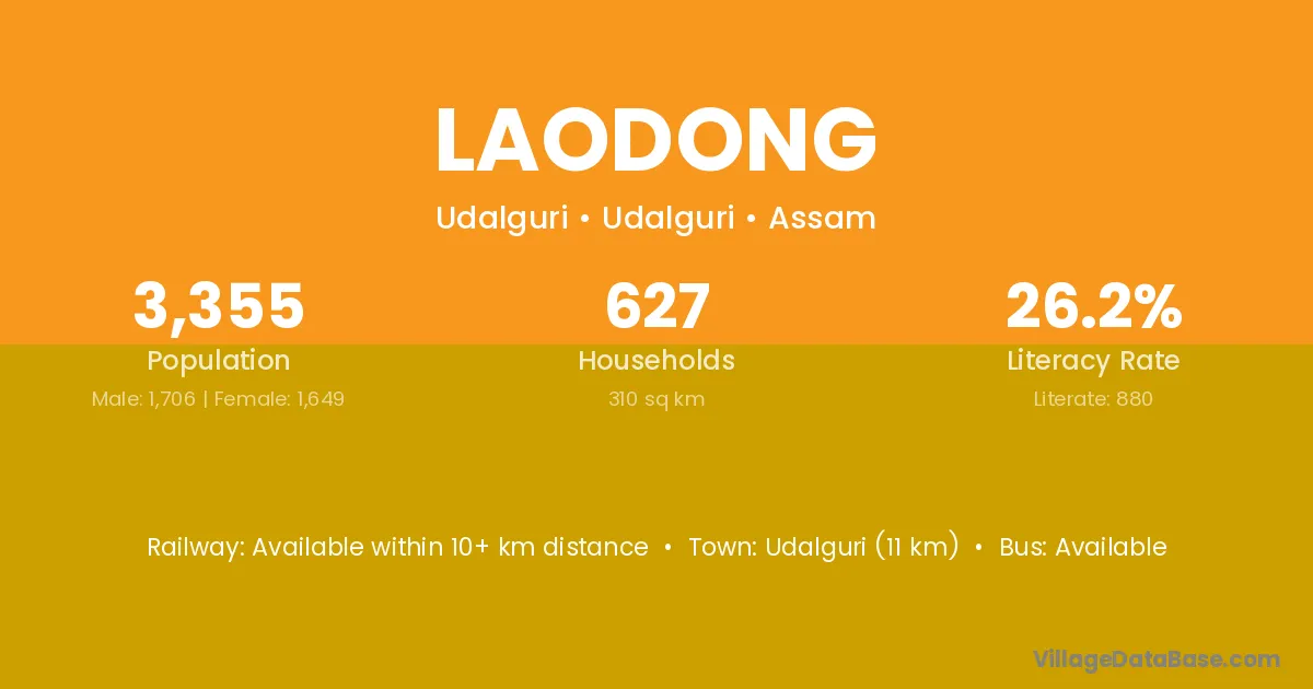 Udalguri (11 km) is the nearest town to Laodong village for major economic activities and is located approximately 11 km away.