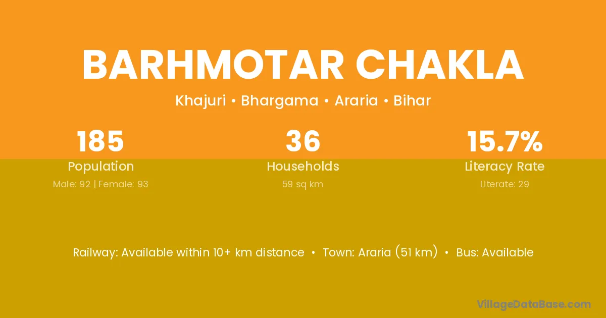 Araria (51 km) is the nearest town to Barhmotar Chakla village for major economic activities and is located approximately 51 km away.