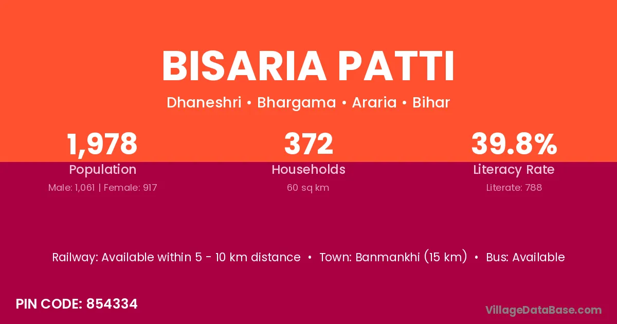Banmankhi (15 km) is the nearest town to Bisaria Patti village for major economic activities and is located approximately 15 km away.