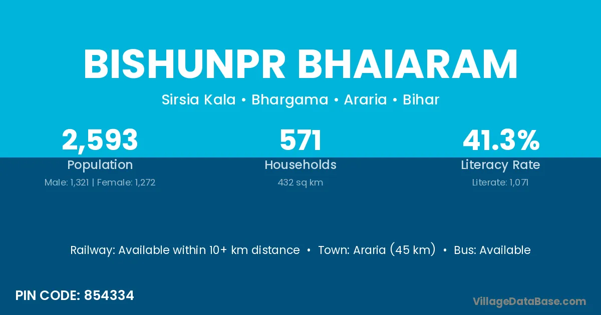 Araria (45 km) is the nearest town to Bishunpr Bhaiaram village for major economic activities and is located approximately 45 km away.