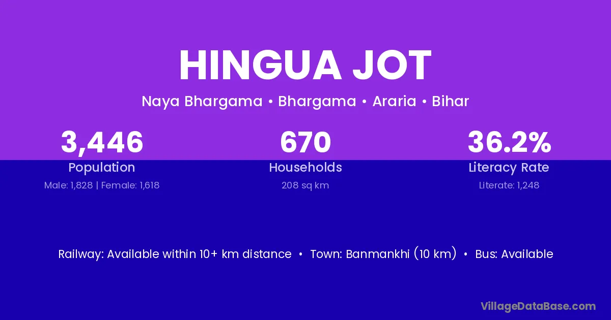 Banmankhi (10 km) is the nearest town to Hingua Jot village for major economic activities and is located approximately 10 km away.