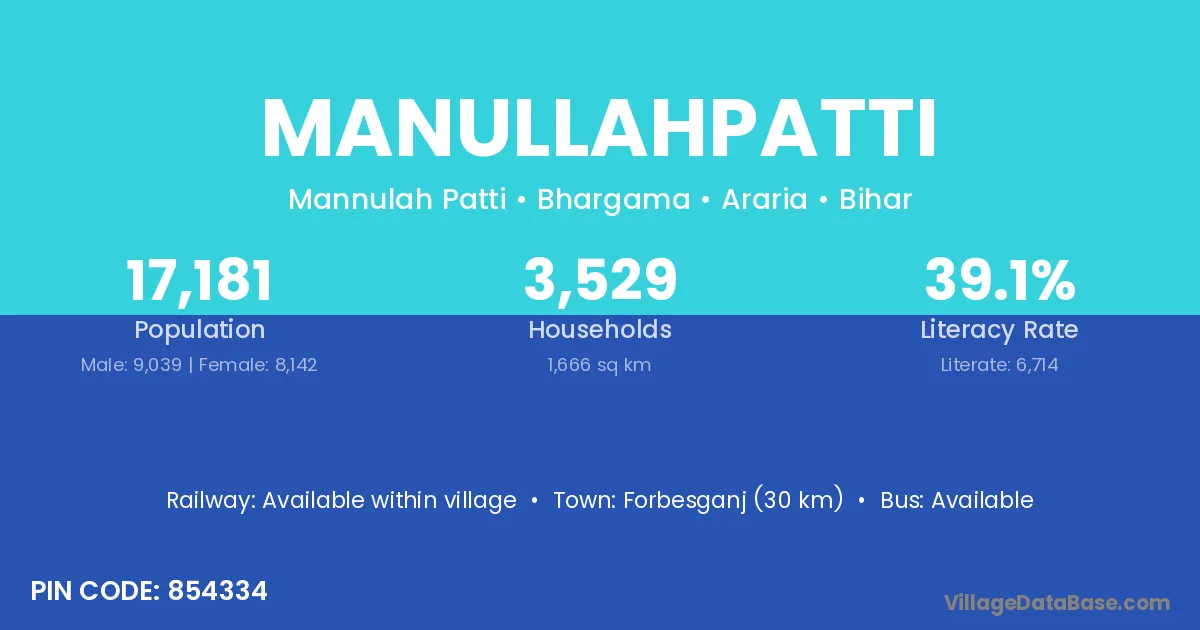 Forbesganj (30 km) is the nearest town to Manullahpatti village for major economic activities and is located approximately 30 km away.