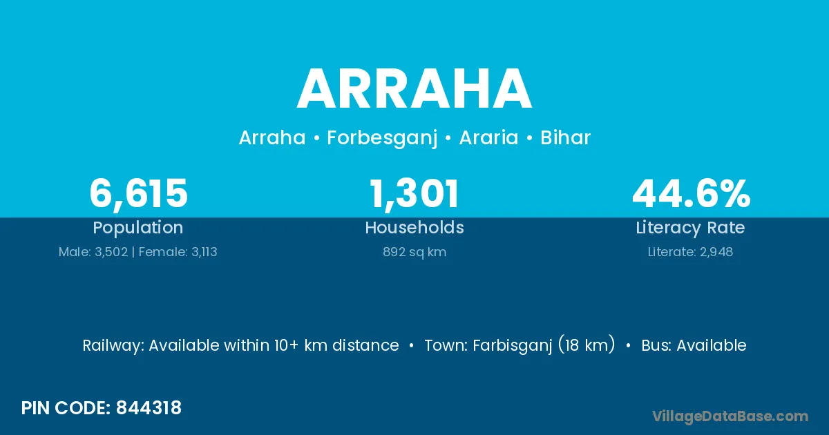 Farbisganj (18 km) is the nearest town to Arraha village for major economic activities and is located approximately 18 km away.