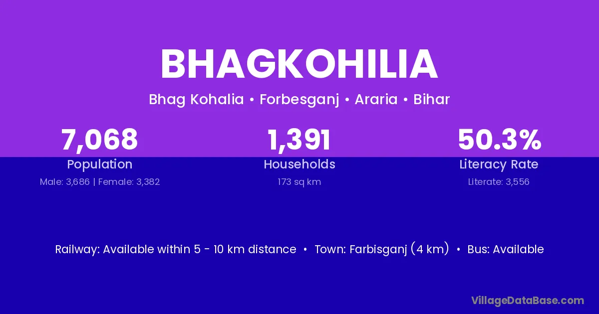 Bhagkohilia village has a total population of 7,068 people, of which 3,686 are males and 3,382 are females.