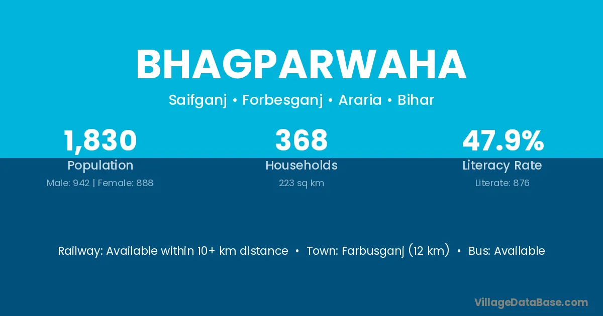 Farbusganj (12 km) is the nearest town to Bhagparwaha village for major economic activities and is located approximately 12 km away.
