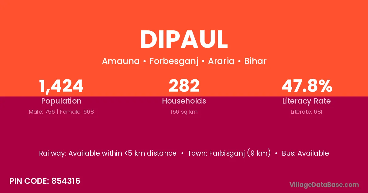 Farbisganj (9 km) is the nearest town to Dipaul village for major economic activities and is located approximately 9 km away.