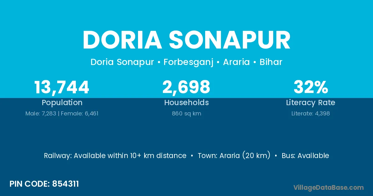 Araria (20 km) is the nearest town to Doria Sonapur village for major economic activities and is located approximately 20 km away.
