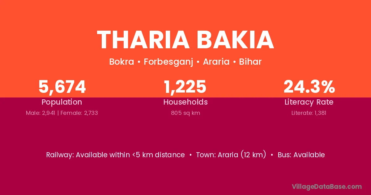 Araria (12 km) is the nearest town to Tharia Bakia village for major economic activities and is located approximately 12 km away.
