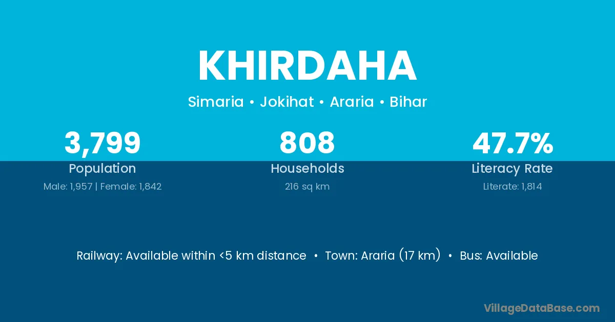 Araria (17 km) is the nearest town to Khirdaha village for major economic activities and is located approximately 17 km away.