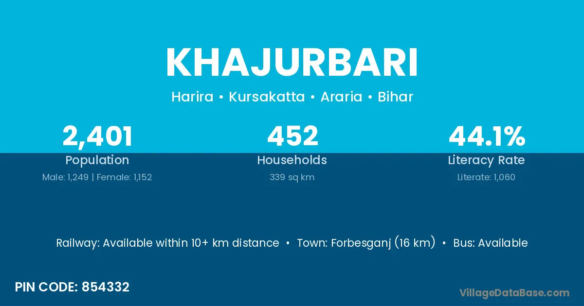 Forbesganj (16 km) is the nearest town to Khajurbari village for major economic activities and is located approximately 16 km away.