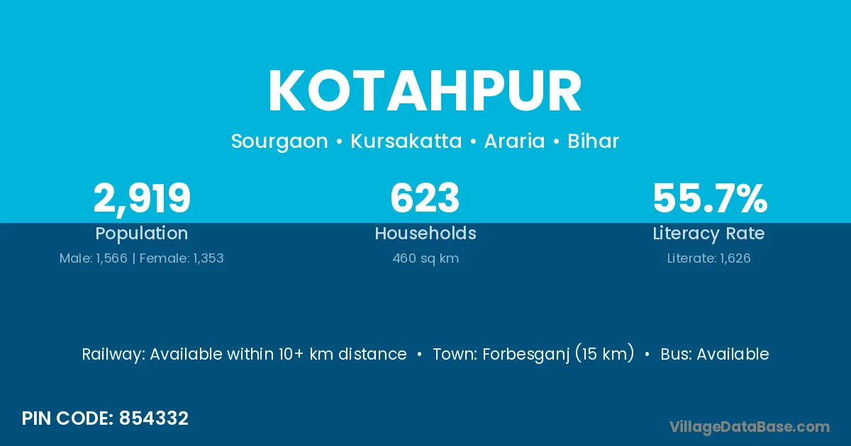 Forbesganj (15 km) is the nearest town to Kotahpur village for major economic activities and is located approximately 15 km away.