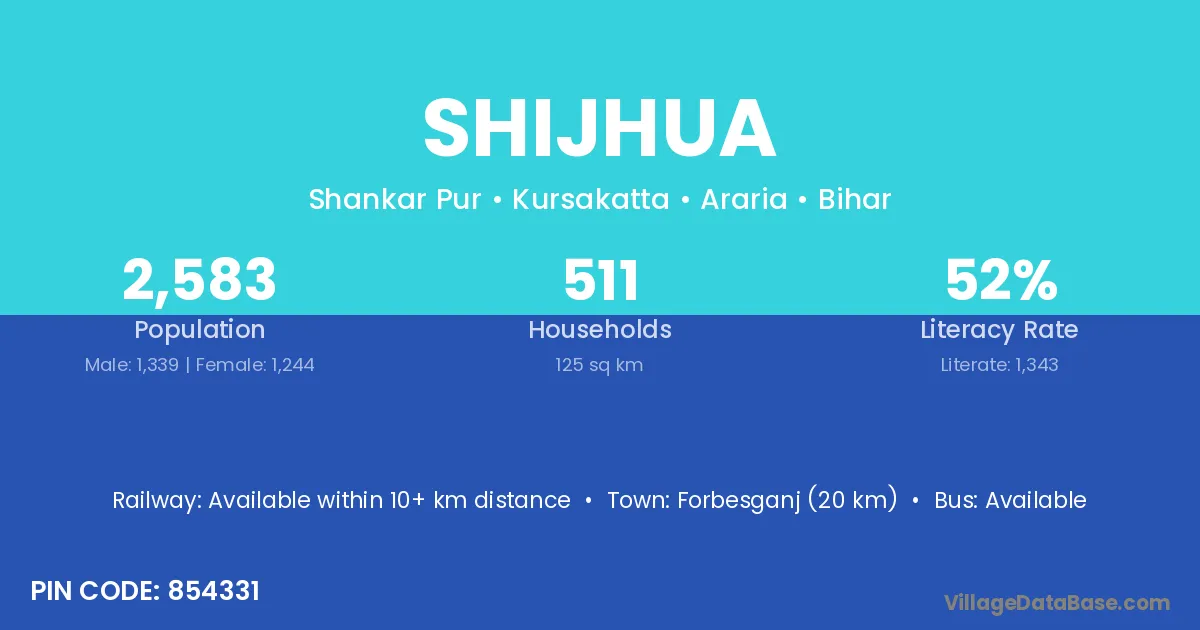 Forbesganj (20 km) is the nearest town to Shijhua village for major economic activities and is located approximately 20 km away.