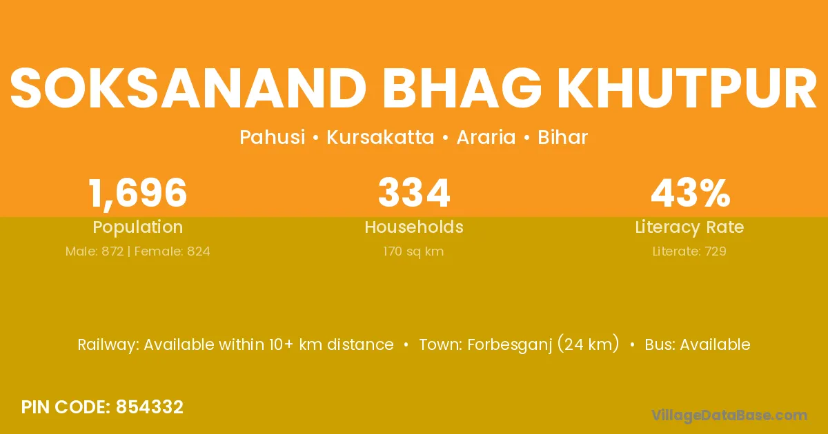 Forbesganj (24 km) is the nearest town to Soksanand Bhag Khutpur village for major economic activities and is located approximately 24 km away.