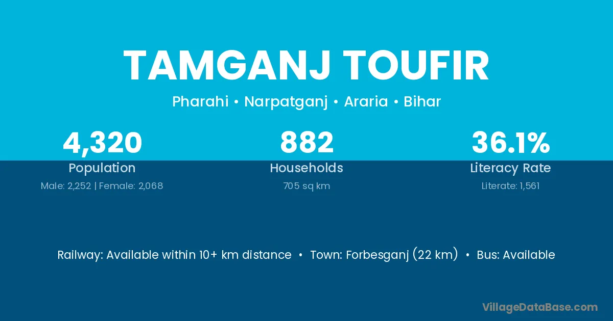 Forbesganj (22 km) is the nearest town to Tamganj Toufir village for major economic activities and is located approximately 22 km away.