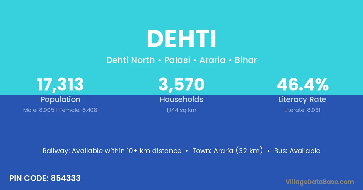 Araria (32 km) is the nearest town to Dehti village for major economic activities and is located approximately 32 km away.