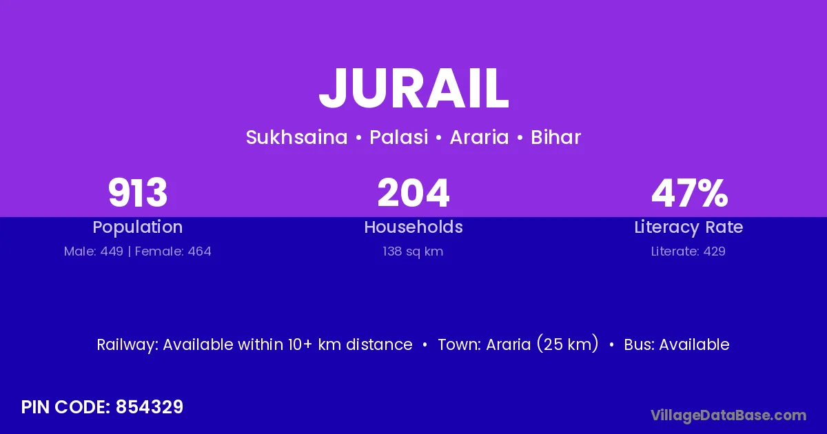 Araria (25 km) is the nearest town to Jurail village for major economic activities and is located approximately 25 km away.