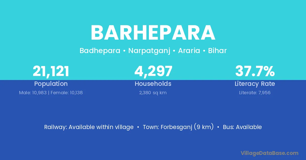 Araria (25 km) is the nearest town to Barhepara village for major economic activities and is located approximately 25 km away.