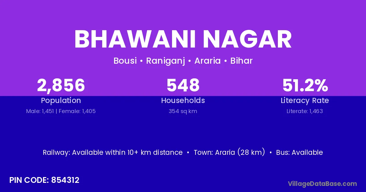 Araria (28 km) is the nearest town to Bhawani Nagar village for major economic activities and is located approximately 28 km away.