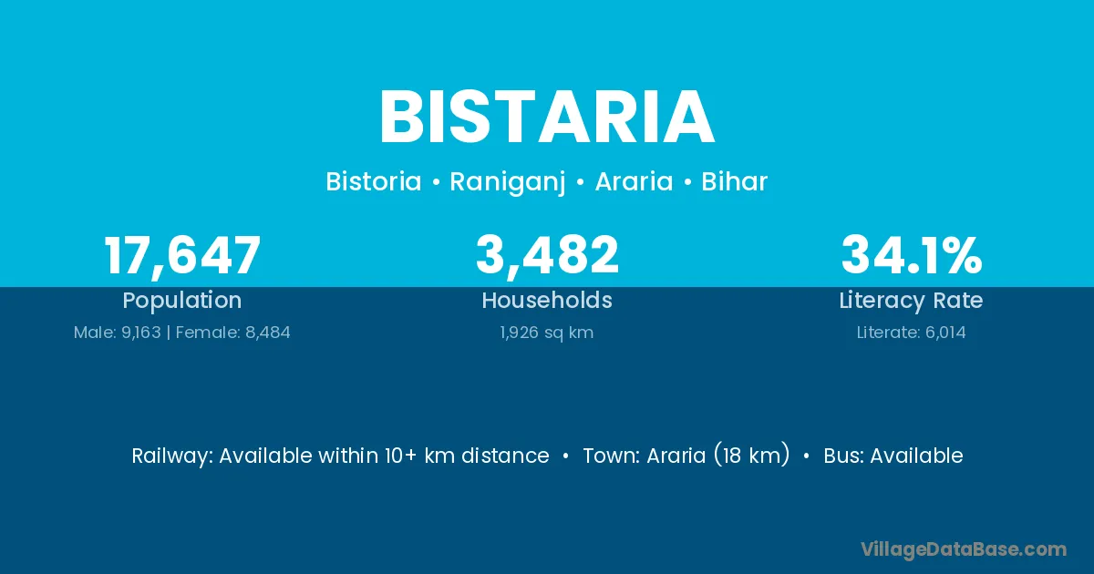 Araria (18 km) is the nearest town to Bistaria village for major economic activities and is located approximately 18 km away.