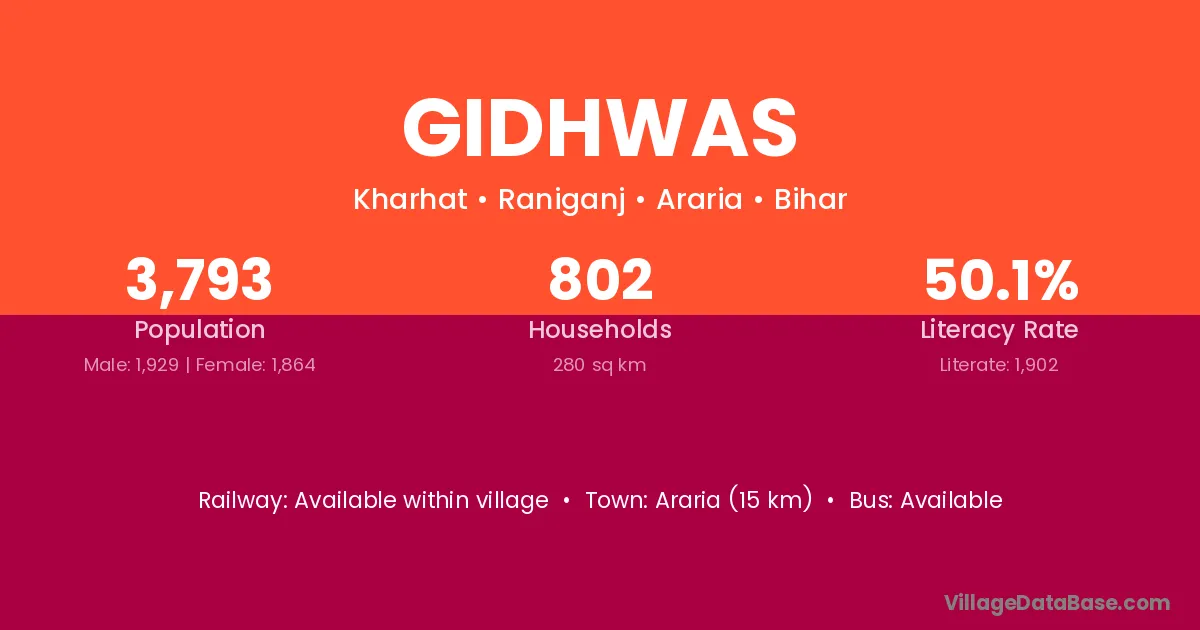 Araria (15 km) is the nearest town to Gidhwas village for major economic activities and is located approximately 15 km away.