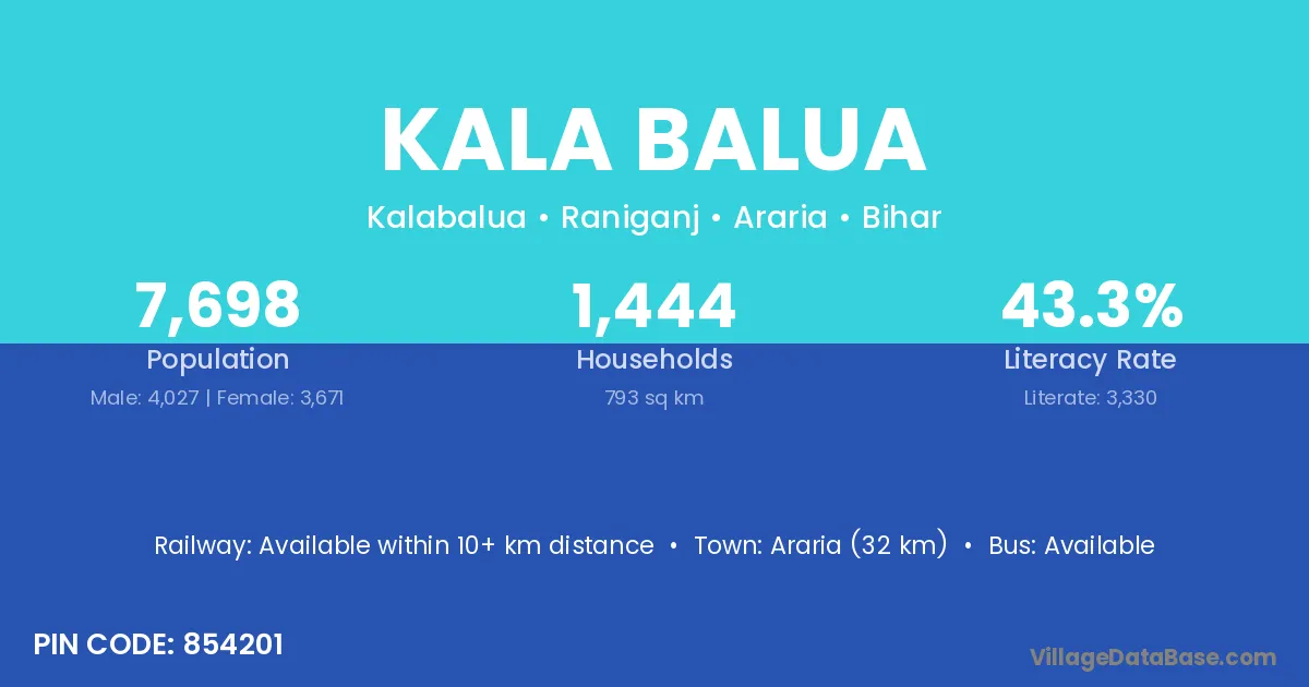 Araria (32 km) is the nearest town to Kala Balua village for major economic activities and is located approximately 32 km away.
