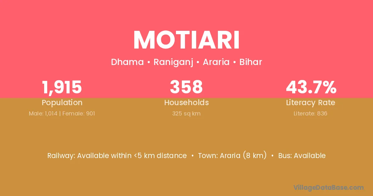 Araria (8 km) is the nearest town to Motiari village for major economic activities and is located approximately 8 km away.