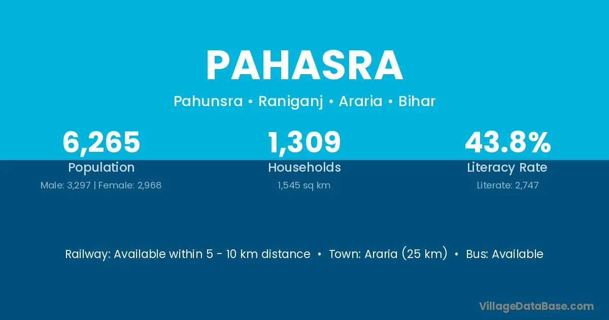 Araria (25 km) is the nearest town to Pahasra village for major economic activities and is located approximately 25 km away.