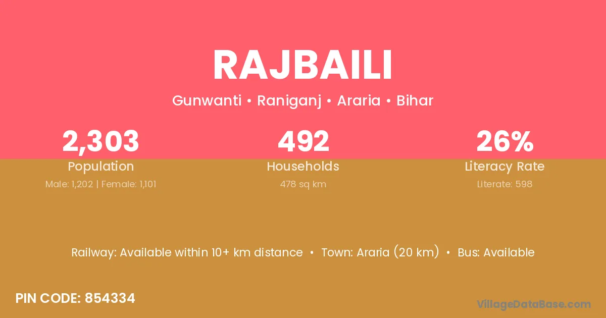 Araria (20 km) is the nearest town to Rajbaili village for major economic activities and is located approximately 20 km away.