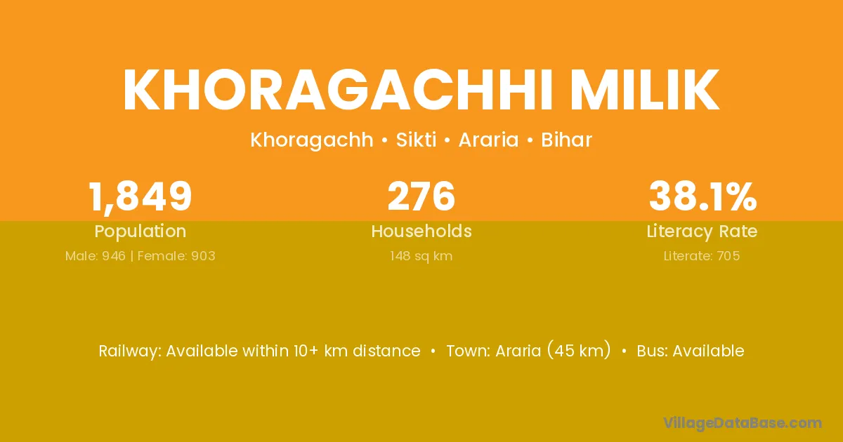 Araria (45 km) is the nearest town to Khoragachhi Milik village for major economic activities and is located approximately 45 km away.