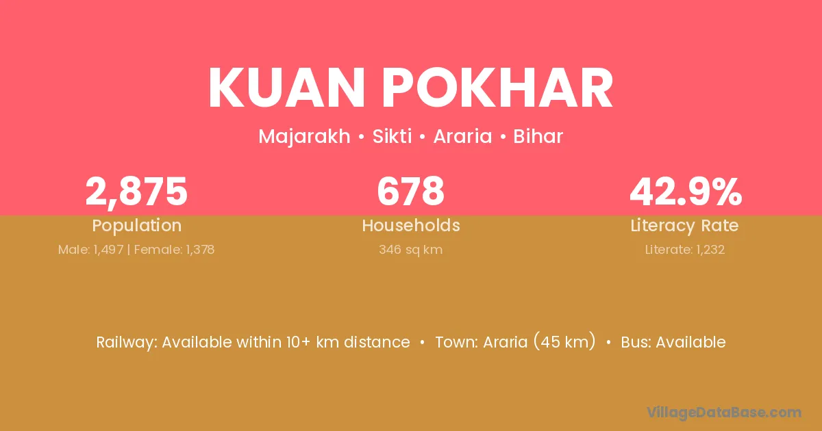 Araria (45 km) is the nearest town to Kuan Pokhar village for major economic activities and is located approximately 45 km away.