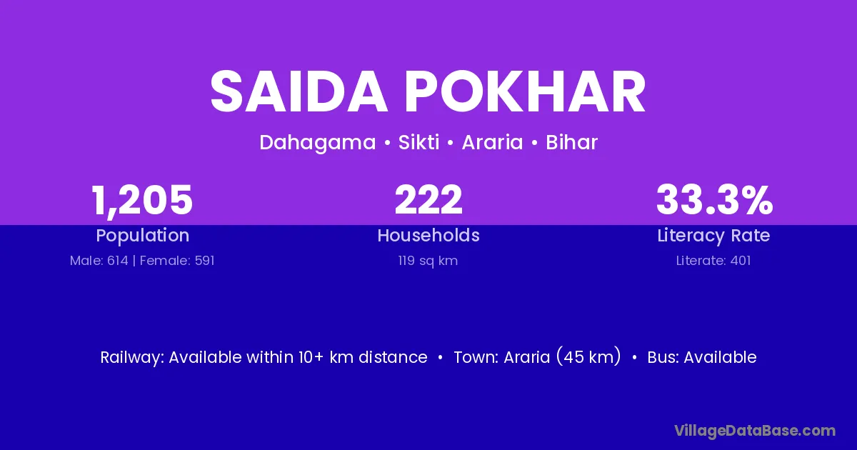 Araria (45 km) is the nearest town to Saida Pokhar village for major economic activities and is located approximately 45 km away.