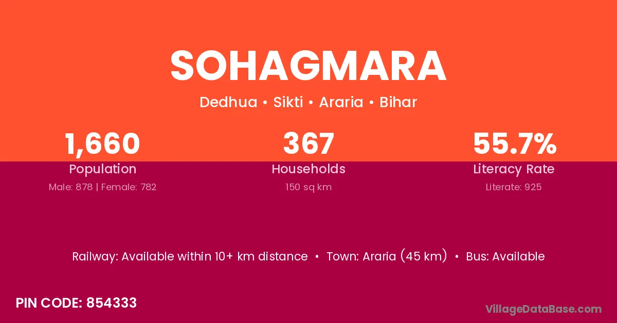 Araria (45 km) is the nearest town to Sohagmara village for major economic activities and is located approximately 45 km away.