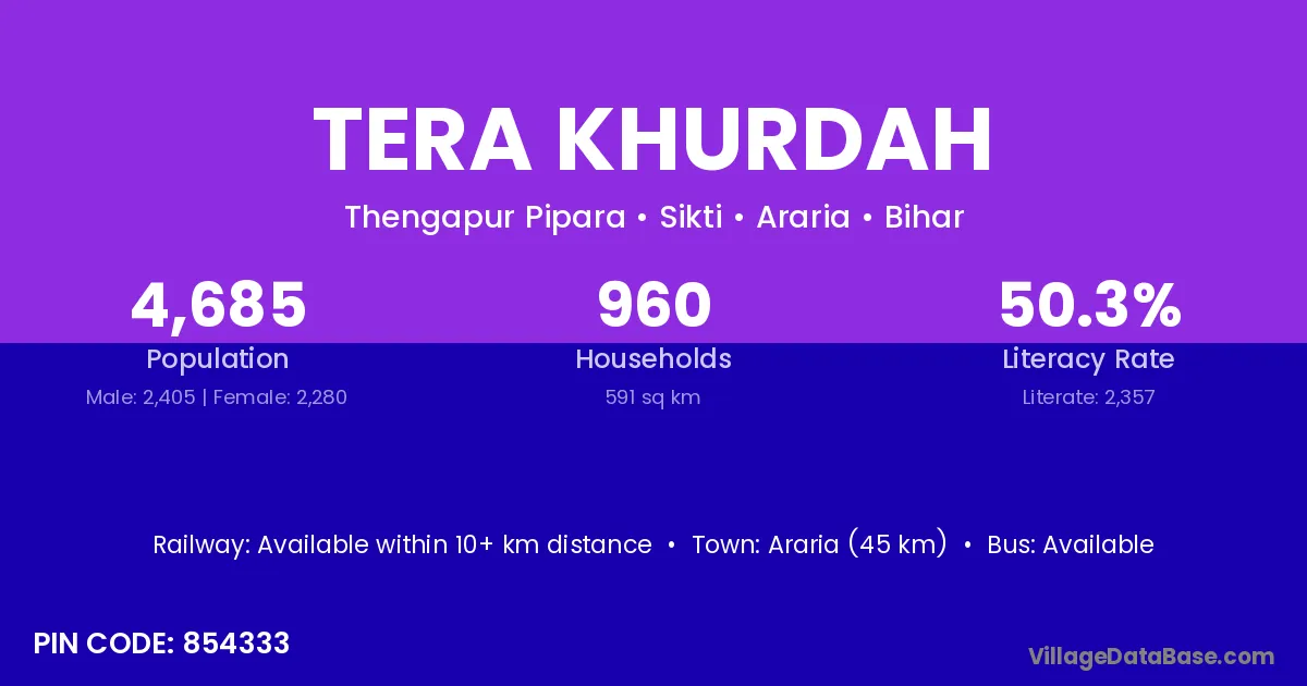 Araria (45 km) is the nearest town to Tera Khurdah village for major economic activities and is located approximately 45 km away.