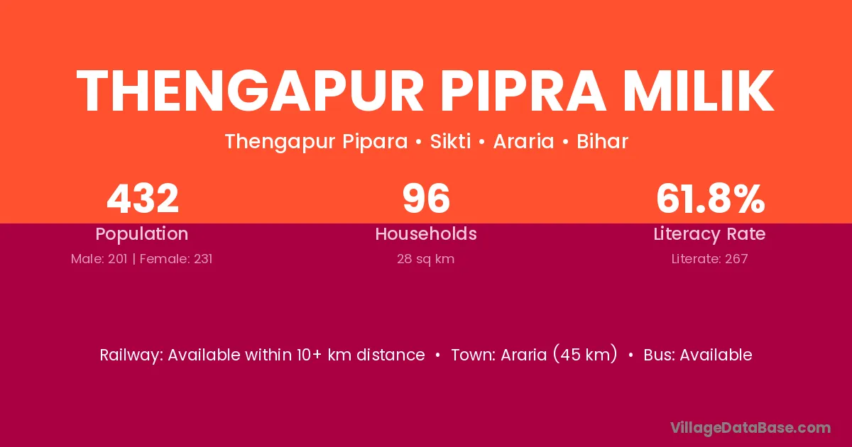 Thengapur Pipra Milik village has a total population of 432 people, of which 201 are males and 231 are females.