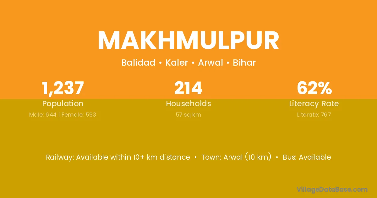 Arwal (10 km) is the nearest town to Makhmulpur village for major economic activities and is located approximately 10 km away.