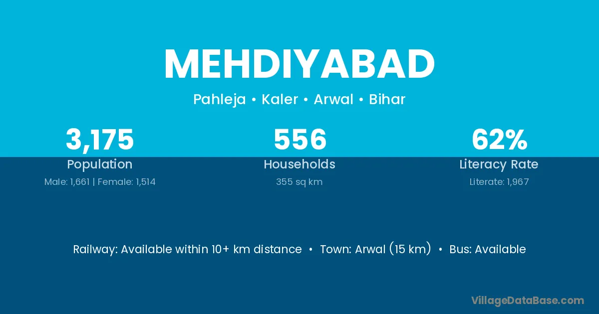 Arwal (15 km) is the nearest town to Mehdiyabad village for major economic activities and is located approximately 15 km away.