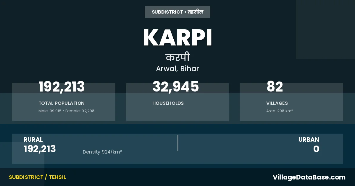 According to the 2011 census The total area of Karpi Subdivision is 208 km², with a population of 192213 people. The population density is 924 inhabitants per square kilometre, and there are approximately 32945 houses in the sub district.