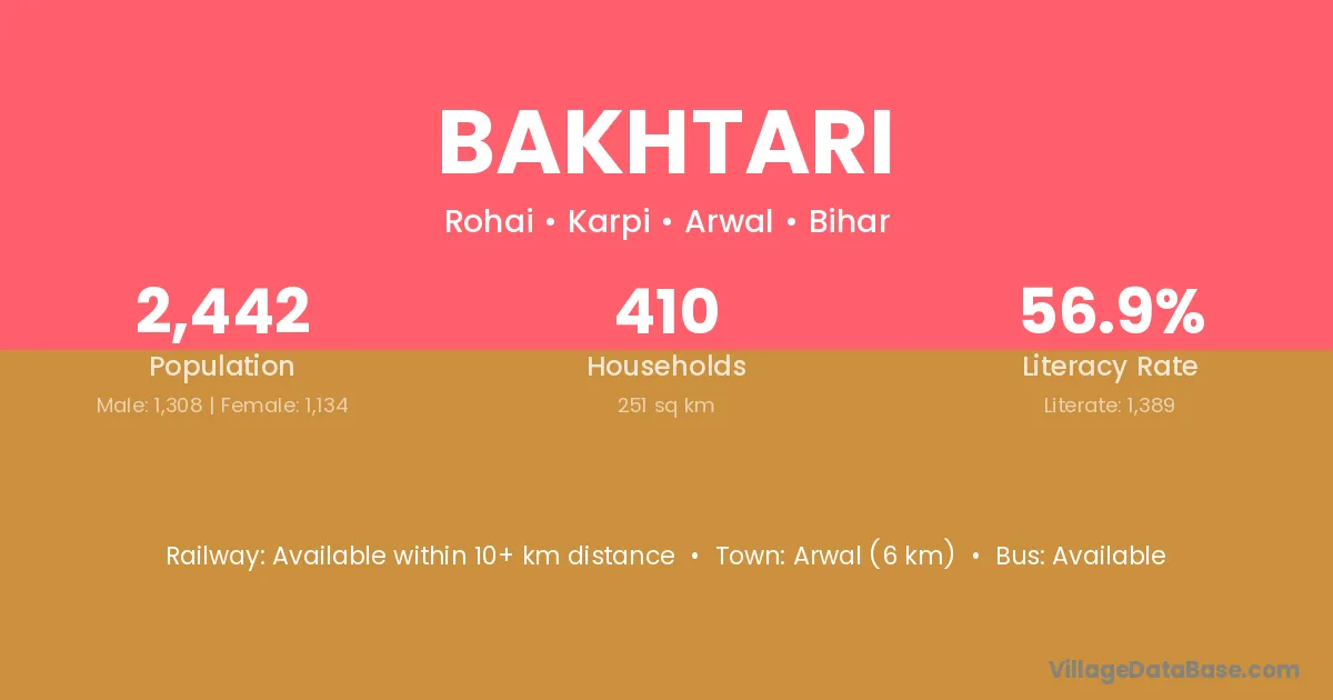 Arwal (6 km) is the nearest town to Bakhtari village for major economic activities and is located approximately 6 km away.