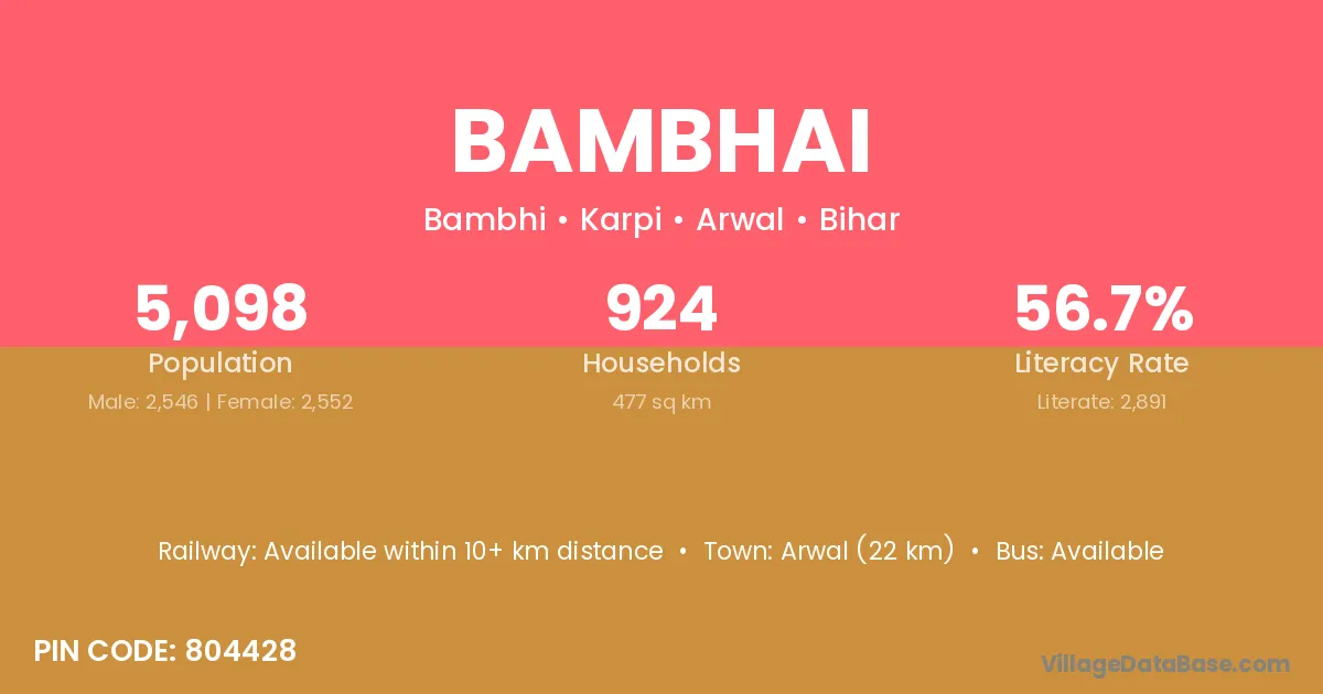 Arwal (22 km) is the nearest town to Bambhai village for major economic activities and is located approximately 22 km away.