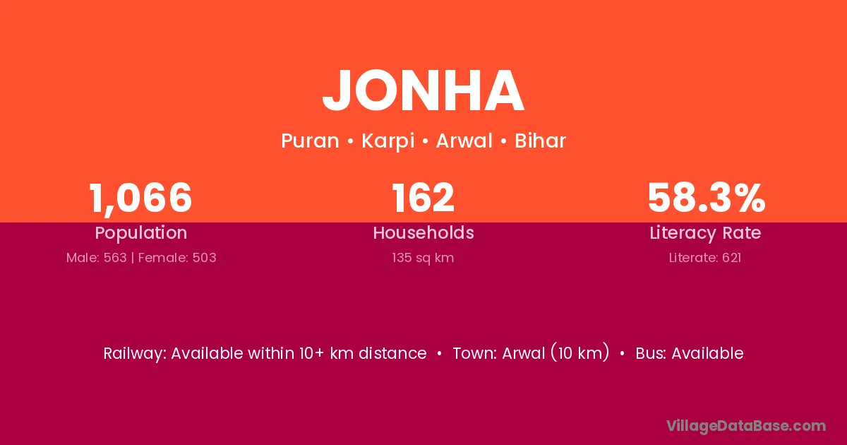 Arwal (10 km) is the nearest town to Jonha village for major economic activities and is located approximately 10 km away.
