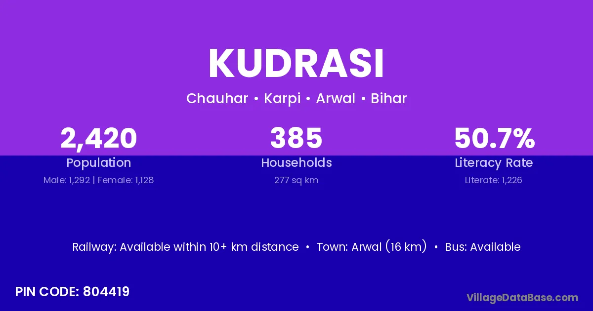 Arwal (16 km) is the nearest town to Kudrasi village for major economic activities and is located approximately 16 km away.