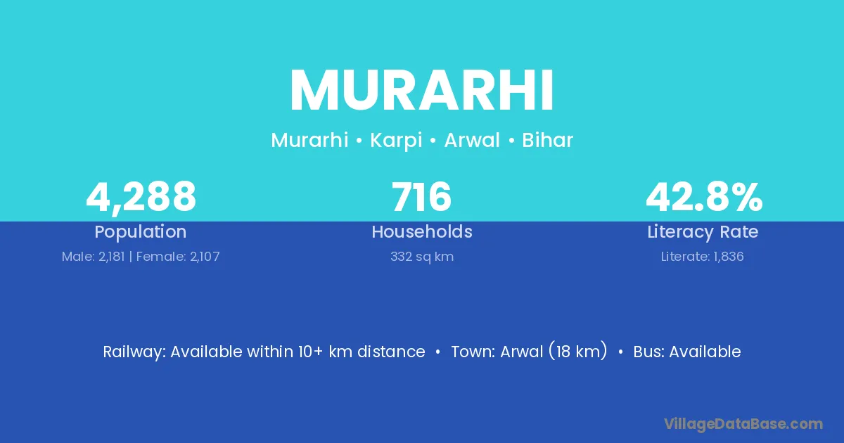 Arwal (18 km) is the nearest town to Murarhi village for major economic activities and is located approximately 18 km away.