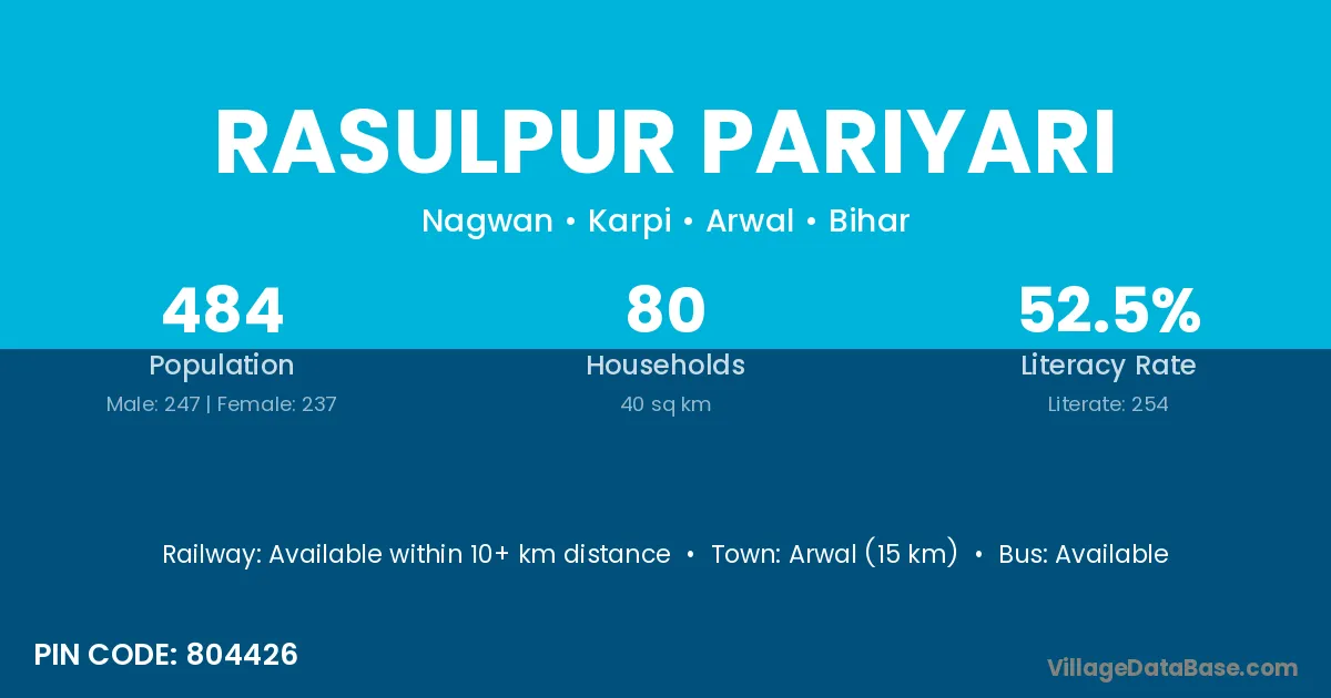 Arwal (15 km) is the nearest town to Rasulpur Pariyari village for major economic activities and is located approximately 15 km away.