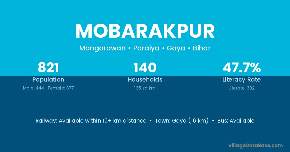 Arwal (32 km) is the nearest town to Mobarakpur village for major economic activities and is located approximately 32 km away.
