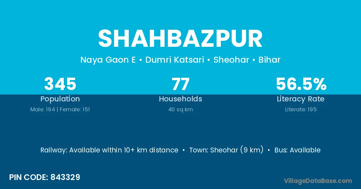 Arwal (33 km) is the nearest town to Shahbazpur village for major economic activities and is located approximately 33 km away.