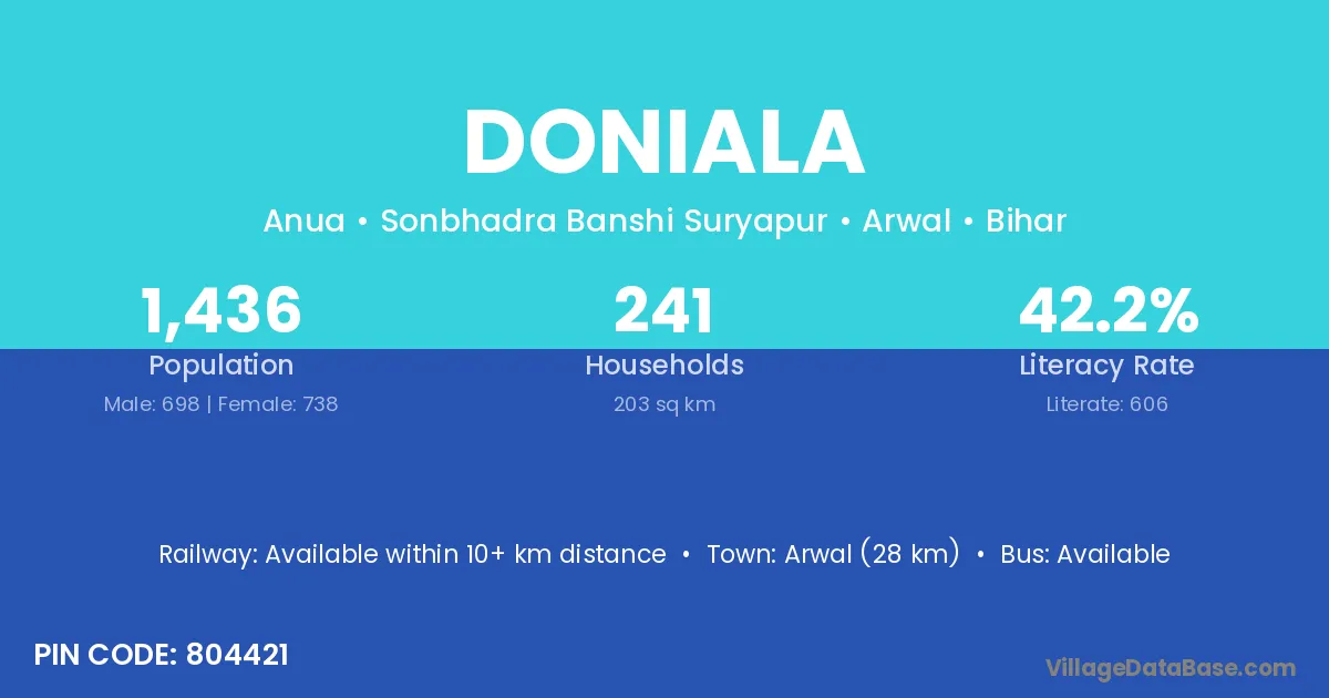Arwal (28 km) is the nearest town to Doniala village for major economic activities and is located approximately 28 km away.